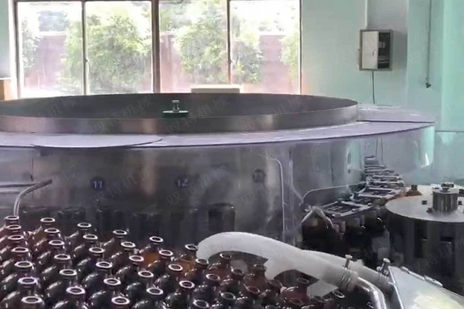 洗瓶機(jī)的過程是空瓶進(jìn)入輸瓶螺桿,由星輪傳動(dòng)到夾瓶工位,洗瓶的整個(gè)過程瓶底均懸空,其優(yōu)點(diǎn)是著力點(diǎn)在瓶頭和頸部,是瓶子厚硬的部分,在清洗過程中不會(huì)損傷或壓扁,洗瓶機(jī)可調(diào)整多種瓶子,且調(diào)整簡便。